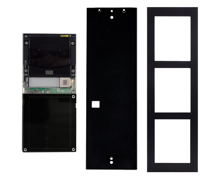 The 2N Surface Installation Frame for 3 IP Verso Modules - Black (9155023B) is a 3 Module Surface-mount Frame in Black for use in completing a 2N Helios IP Verso Modular Door Intercom system.