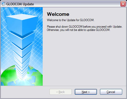 Once gloCOM running in system try is shut down, Update Welcome window is displayed. Click 'Next' button to proceed with the update or 'Cancel' to exit the update wizard.